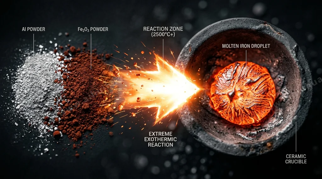 一张铝热反应的微观照片级概念流程图。从细腻银白色的铝粉与暗红色的氧化铁粉末混合物开始,通过如恒星核心般极为刺眼、喷射火星的白炽能量箭头过渡,最后在一个耐高温的高级陶瓷坩埚中凝固成一颗赤热发光、表面布满流线型熔渣的纯铁熔滴。电影级光照,深微距景深,锐利对焦于熔融金属的纹理与光泽,深沉阴暗的背景,高端科学杂志插图风格。 --ar 16:9 --size 1K
