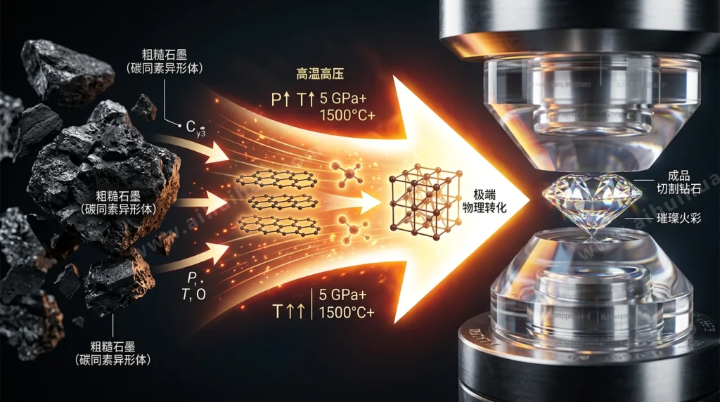 一张碳同素异形体转化(钻石生成)的微观照片级概念流程图。从粗糙、吸光的哑光黑石墨碎块开始,通过散发着白热化高温高压的耀眼能量箭头过渡,最后在一个高科技透明蓝宝石砧中蜕变成一颗切割完美、折射出璀璨火彩的无瑕钻石。电影级光照,深微距景深,锐利对焦于晶体切面与材质纹理,深沉阴暗的背景,高端科学杂志插图风格。 --ar 16:9 --size 1K