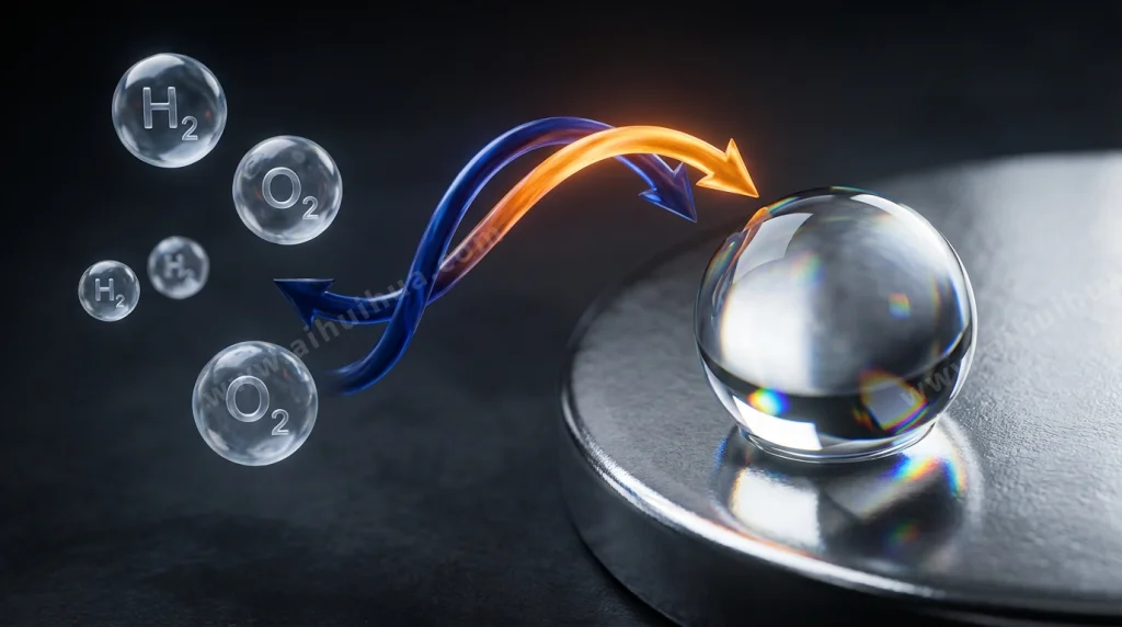 一张水分子合成反应的微观照片级概念流程图。从空灵漂浮的透明氢气和氧气微气泡群开始,通过幽蓝色与明橙色交织的爆燃能量箭头过渡,最后在一个高级抛光铂金表面凝结成一颗完美折射光线的、超清透的纯净水滴。电影级光照,深微距景深,锐利对焦于水滴折射与表面张力的细节,深沉阴暗的背景,高端科学杂志插图风格。 --ar 16:9 --size 1K
