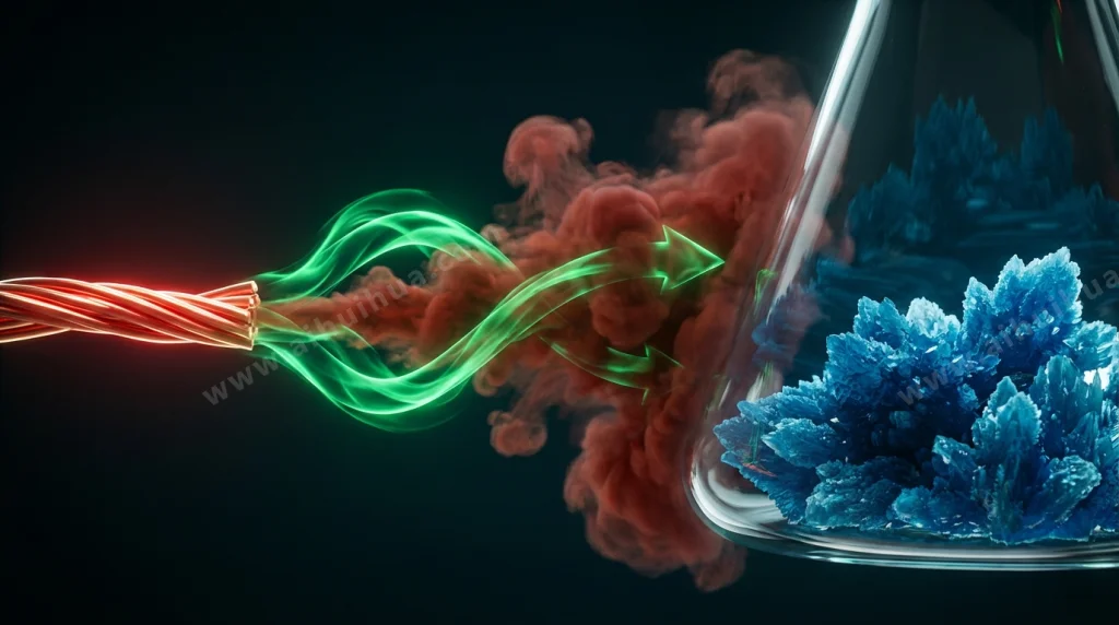 一张铜与硝酸反应的微观照片级概念流程图。从闪耀着红金色泽的纯铜细丝开始,通过翻滚的翠绿色腐蚀性能量箭头与浓郁的红棕色毒气过渡,最后在一个顶级石英烧瓶底部绽放出如冰霜般冷艳、深邃迷人的海蓝色硝酸铜晶簇。电影级光照,深微距景深,锐利对焦于化学物质的纹理,深沉阴暗的背景,高端科学杂志插图风格。 --ar 16:9 --size 1K