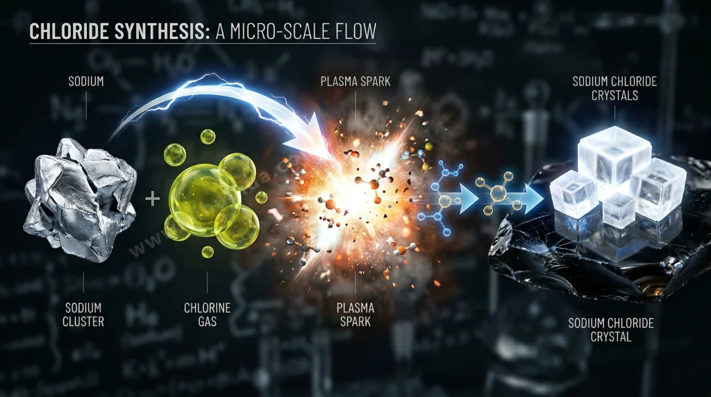 一张氯化钠合成反应的微观照片级概念流程图。从具有冷冽金属光泽的银白色钠块和黄绿色的氯气气泡开始,通过耀眼的电弧能量箭头过渡成剧烈的等离子火花,最后在一块光滑的黑曜石基底上结晶成完美、纯净发光的正方体白色盐晶。电影级光照,深微距景深,锐利对焦于化学物质的纹理,深沉阴暗的背景,高端科学杂志插图风格。 --ar 16:9 --size 2K