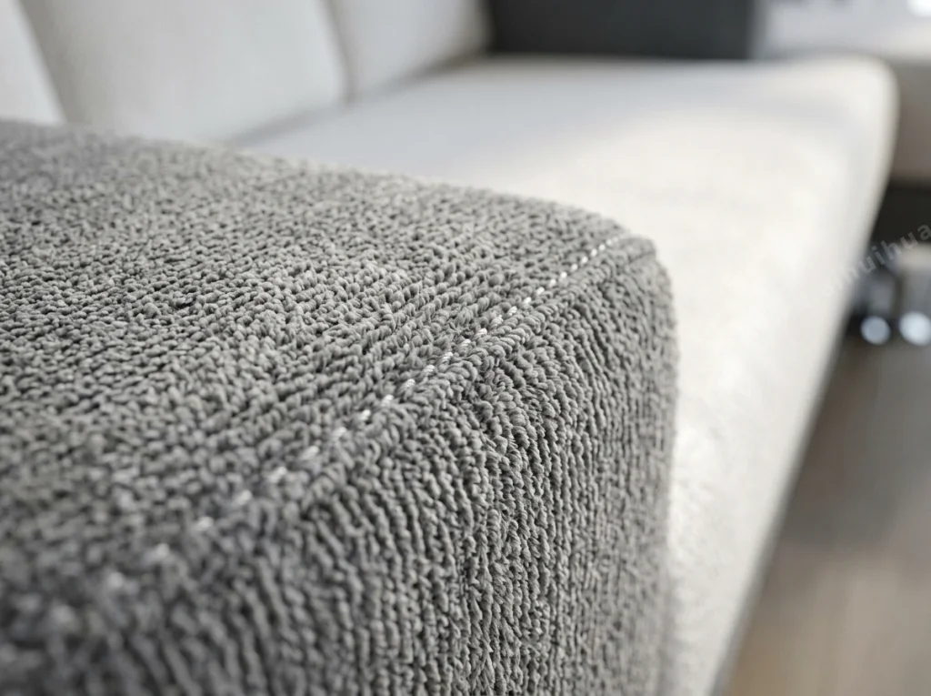 沙发扶手处的微距特写,展示精致的缝线工艺和高级的灰色雪尼尔面料细节,纤维感清晰可见,浅景深效果,背景虚化,柔和的侧向自然光,突出材质的亲肤感和精湛做工,超高清,写实主义,8k分辨率。