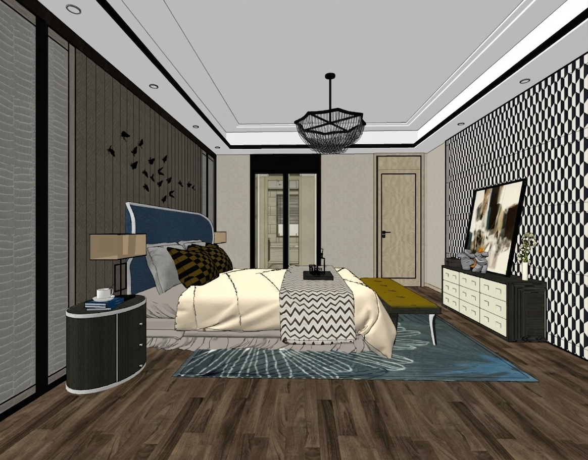 将图1的SU模型渲染成实景照片,清晨柔和自然光从室内窗户洒入,木质地板纹理清晰,墙面装饰细节真实,床上用品质感细腻,软装纹理自然,摄影级质感,8K分辨率,高细节,暖色调氛围